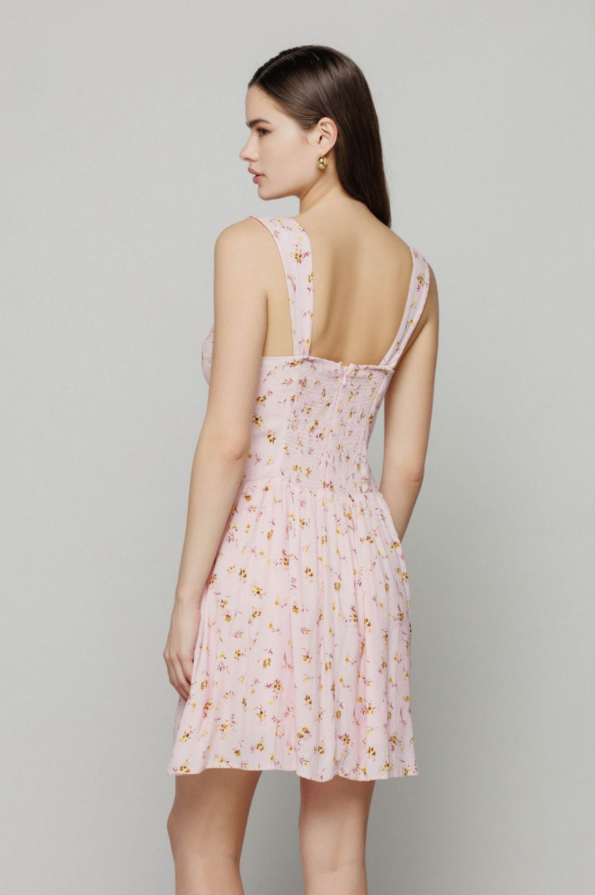 Claire - abito corto in crêpe con scollo a cuore. Spallina larga regolabile con bottoncini interni. Gonna a ruota. Punto smoke sul retro