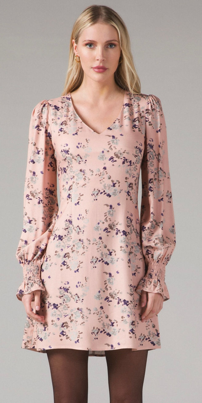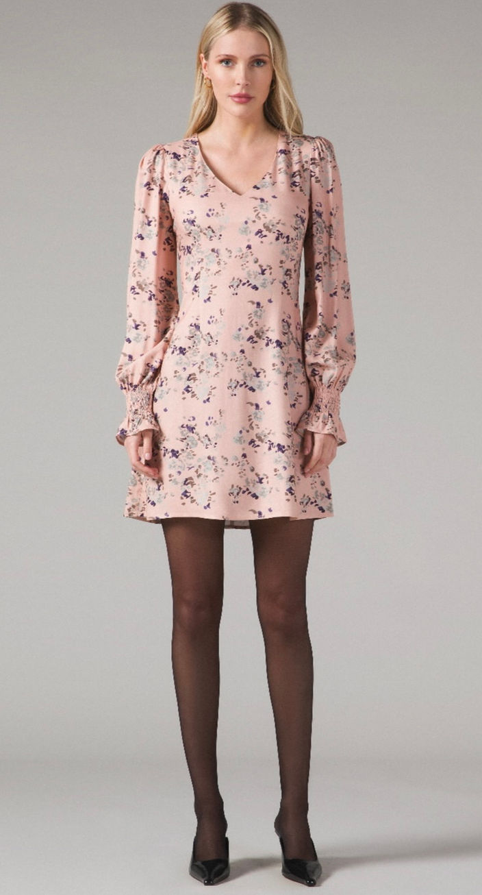 Abito Corto In Crepe Con Scollo V e Punto Smock sul Retro. Polsino con Arricciatura