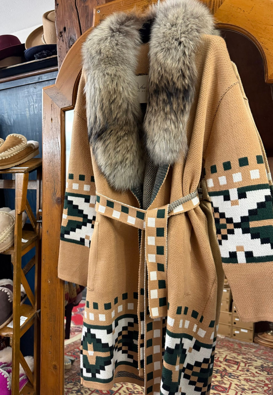 Cardigan lungo beige collo volpe verde militare