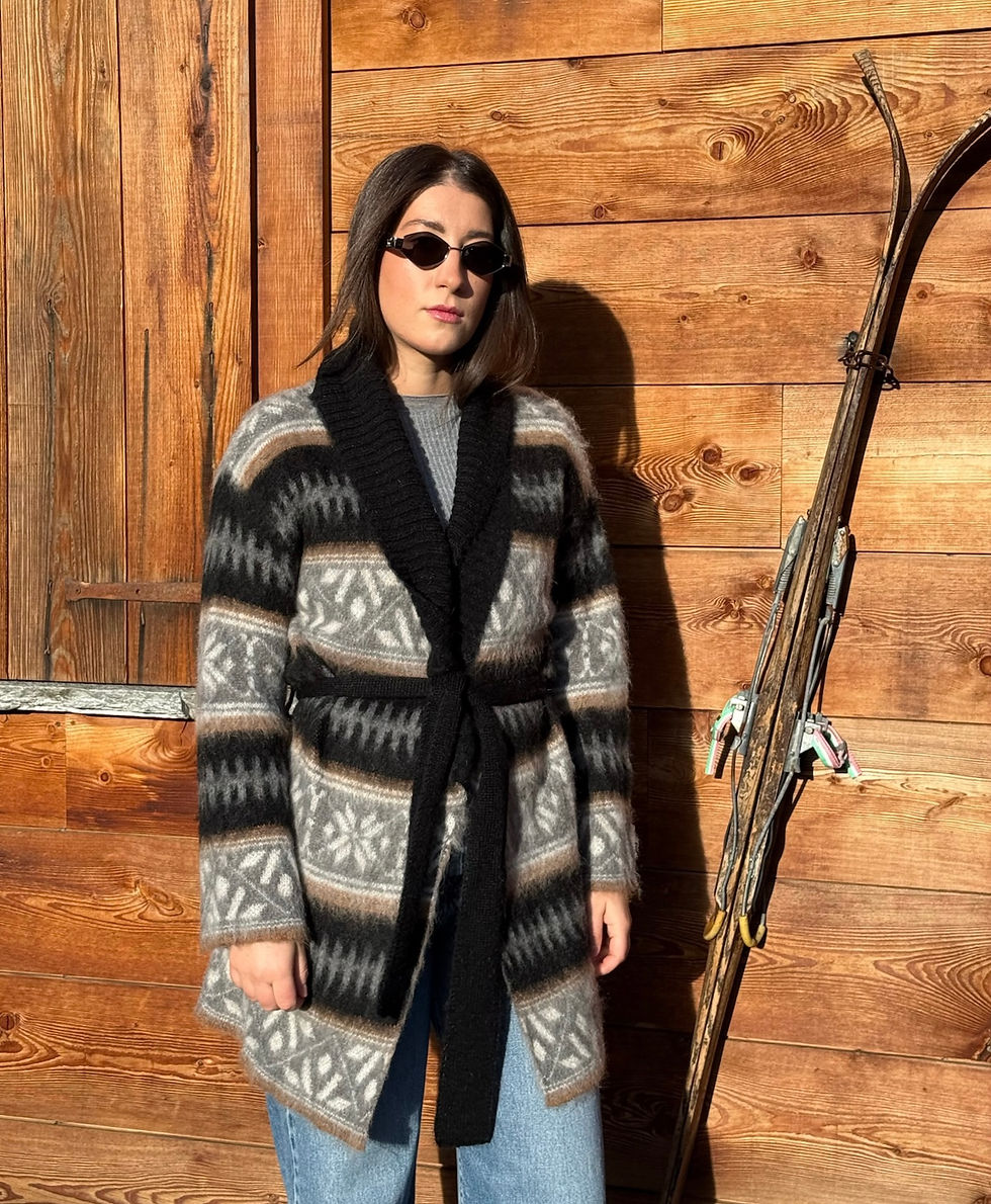 Cardigan lungo con cintura fantasia nei toni del grigio antracite, nero e burgundy.