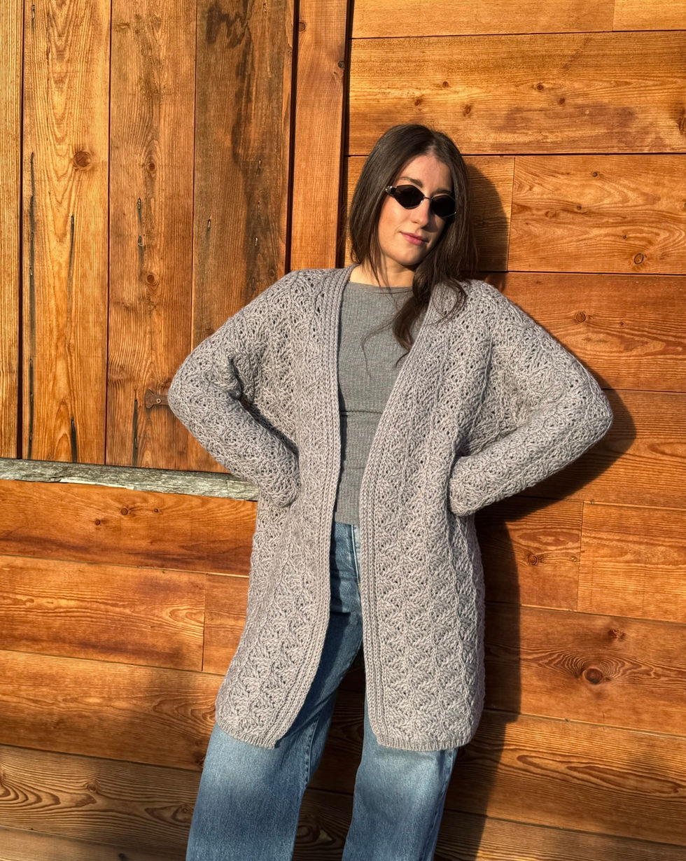 Cardigan lungo traforato in tinta unita grigio.