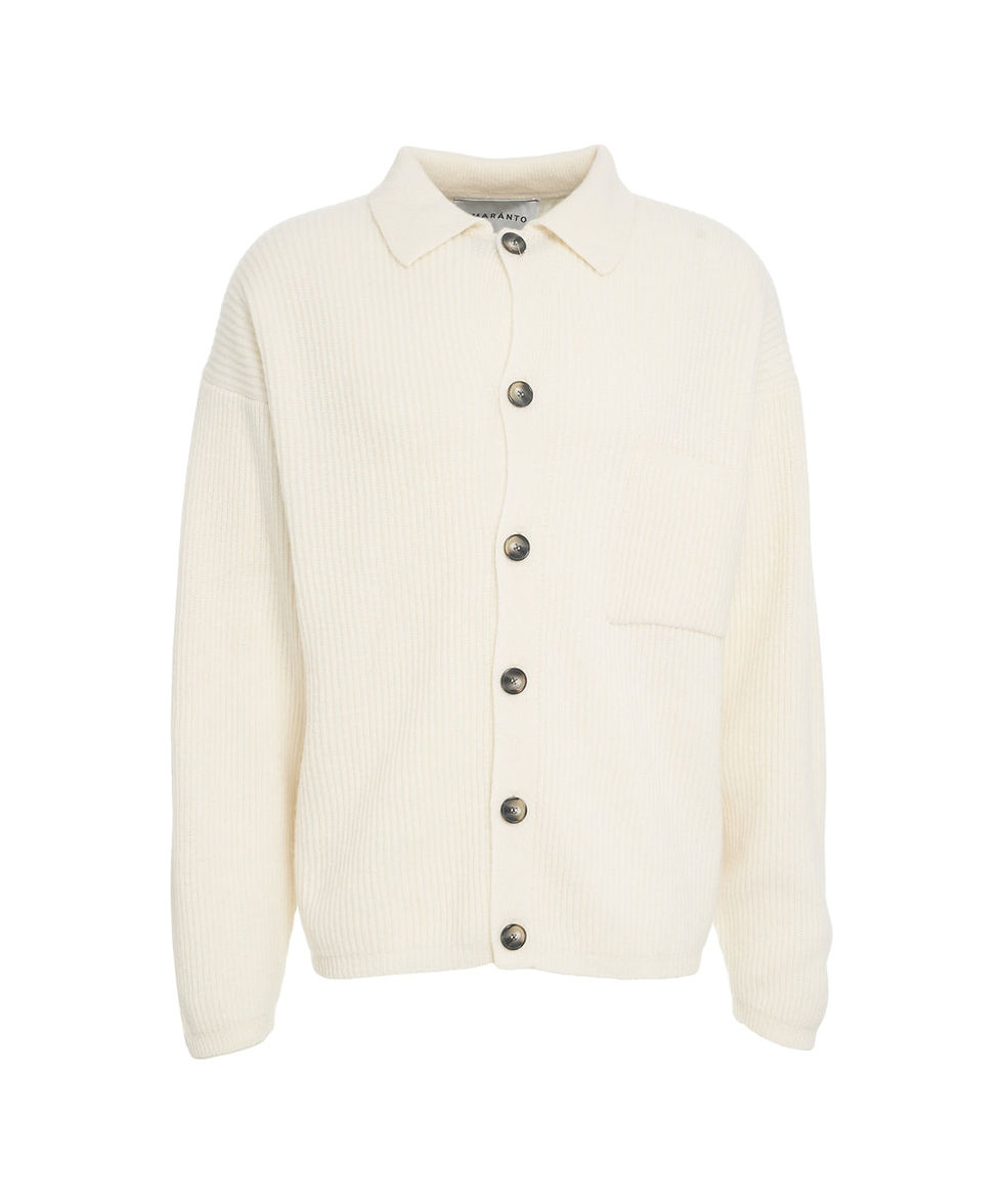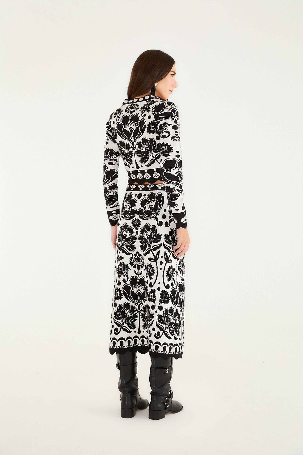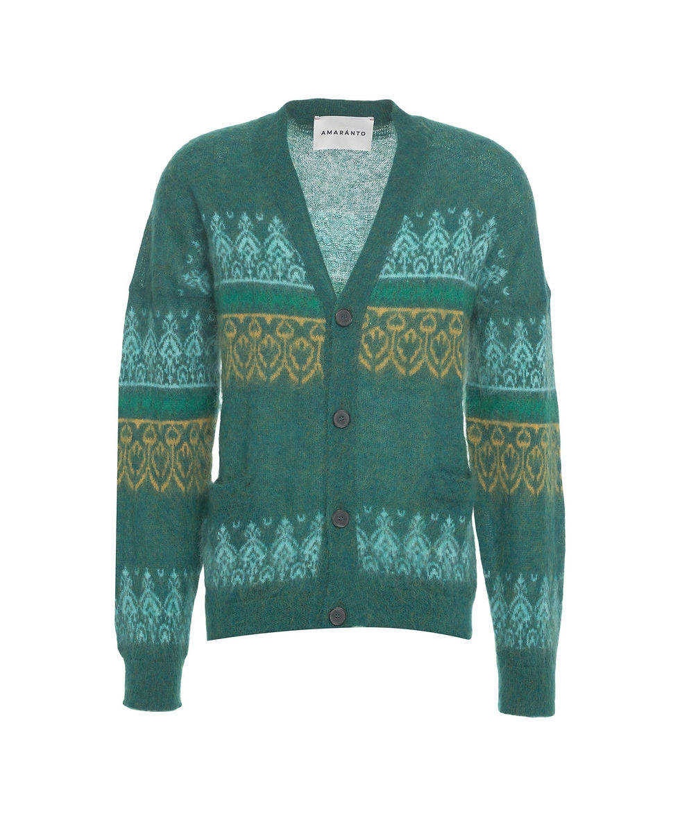 Cardigan dal motivo floreale jacquard in rossi audaci, blu e crema, splendidamente diviso tra sfondi chiari e scuri. La silhouette è rilassata e la profonda scollatura a V.
