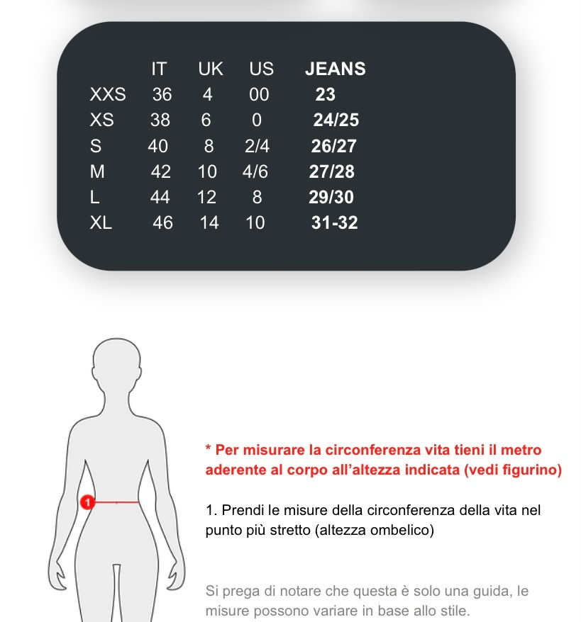 - Si consiglia di prendere la taglia abituale