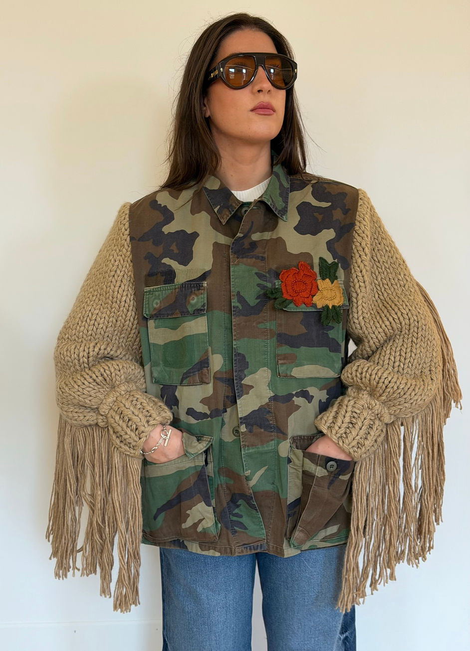 Giacca sahariana maniche lunghe con stampa militare. Chiusura frontale con bottoni nascosti. Maniche in maglia crochet. Frange sul retro del capo.