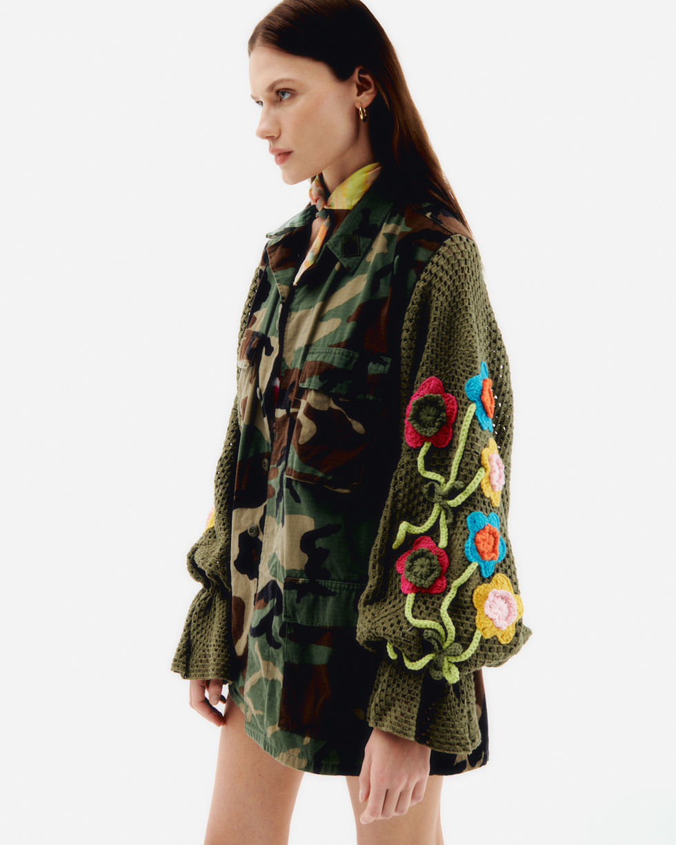 Questa giacca sahariana camouflage con maniche lunghe presenta una chiusura frontale con bottoni nascosti per un look pulito e versatile, mentre le maniche in maglia crochet con fiori applicati aggiungono un tocco colorful.