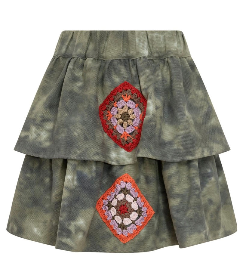 Gonna corta a balze con dettagli crochet sul davanti. Elastico in vita.