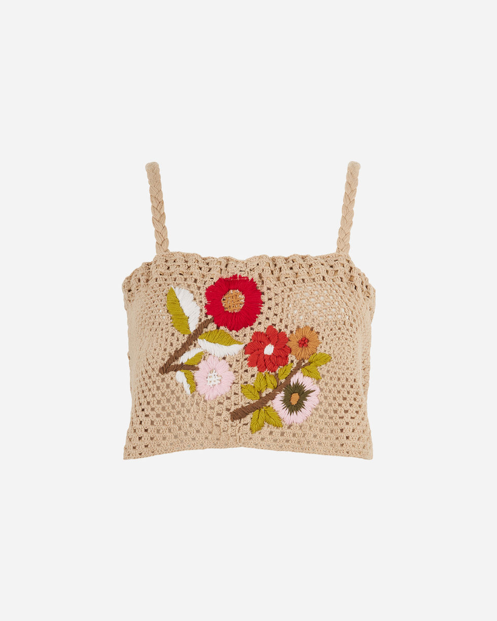 Top a fascia crochet con spalline intrecciate e fiori ricamati.